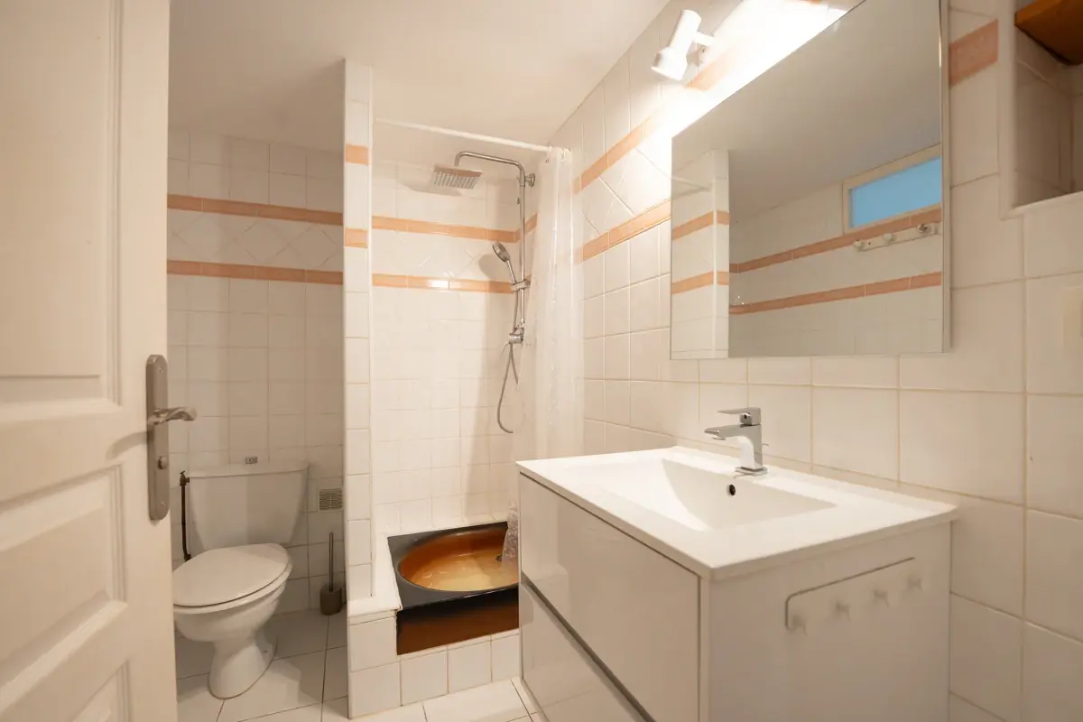 L'étage offre deux chambres, une salle de bain et un dégagement. Au rez de jardin, avec son entrée