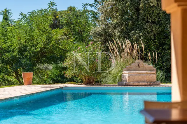 Parc de 9 635 m² offrant des perspectives paysagères et une vue panoramique sur la Sainte-Victoire. Garages et espaces extérieurs exploitables.