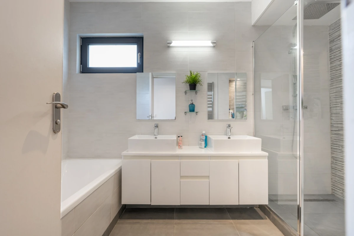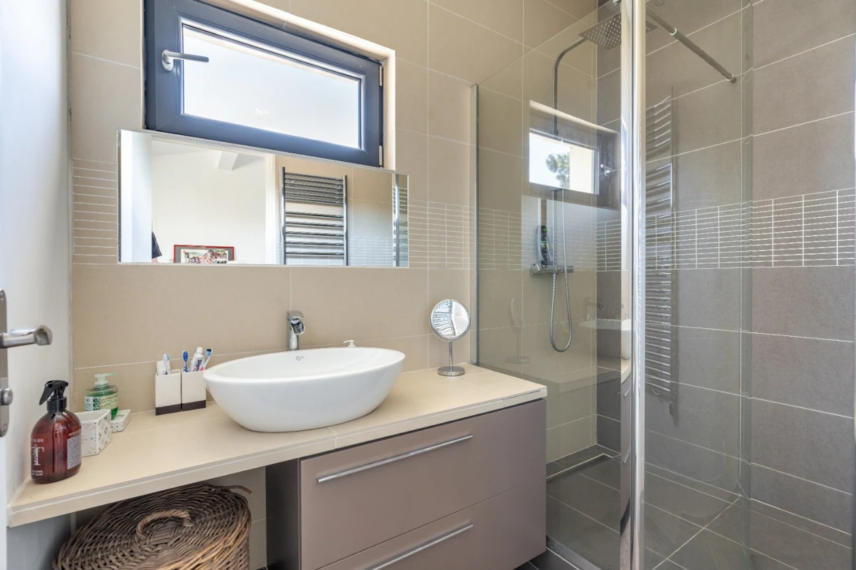 Le calme de la nuit est préservé avec deux chambres confortables, une salle de bain partagée et une suite parentale au niveau inférieur. Au niveau supérieur se trouve une quatrième chambre pouvant servir de bureau, avec sa propre salle de bain.