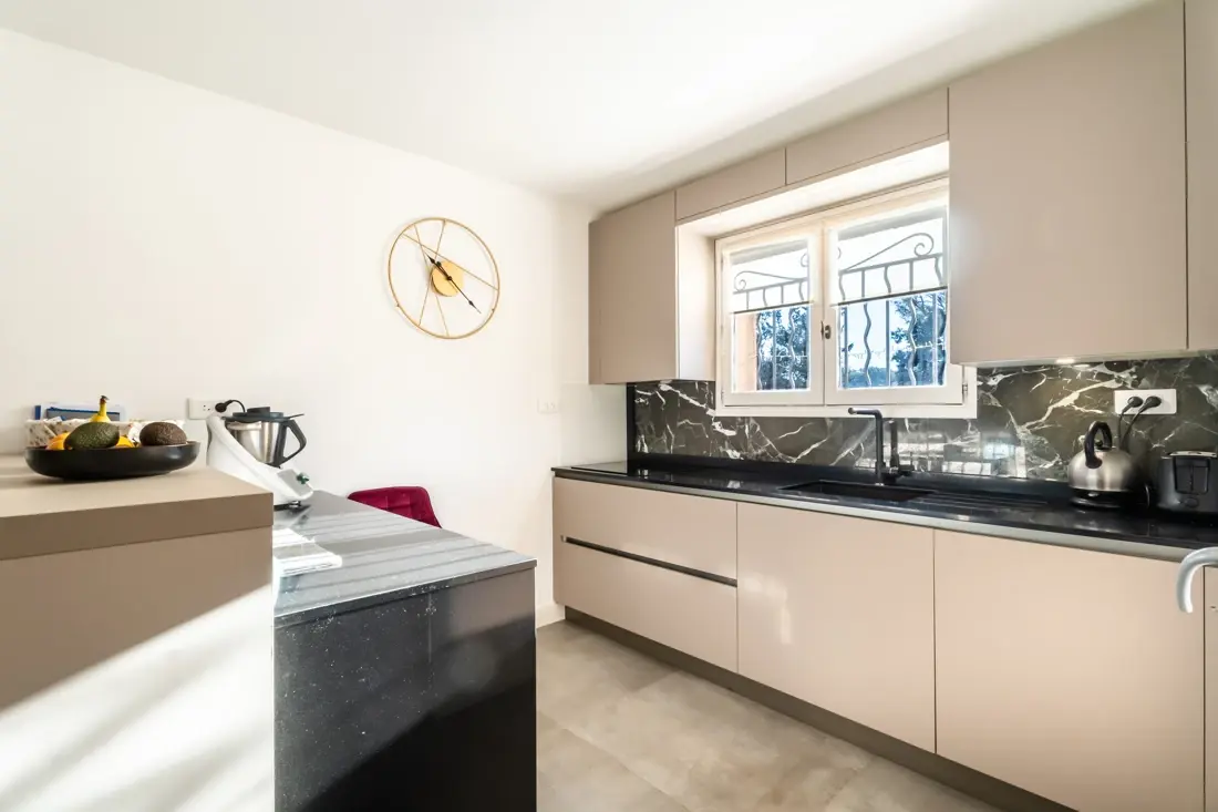 Découvrez un intérieur éclatant de lumière avec un salon spacieux attenant à une cuisine américaine équipée et fonctionnelle, complété par une arrière-cuisine pratique, le tout dans une atmosphère conviviale.