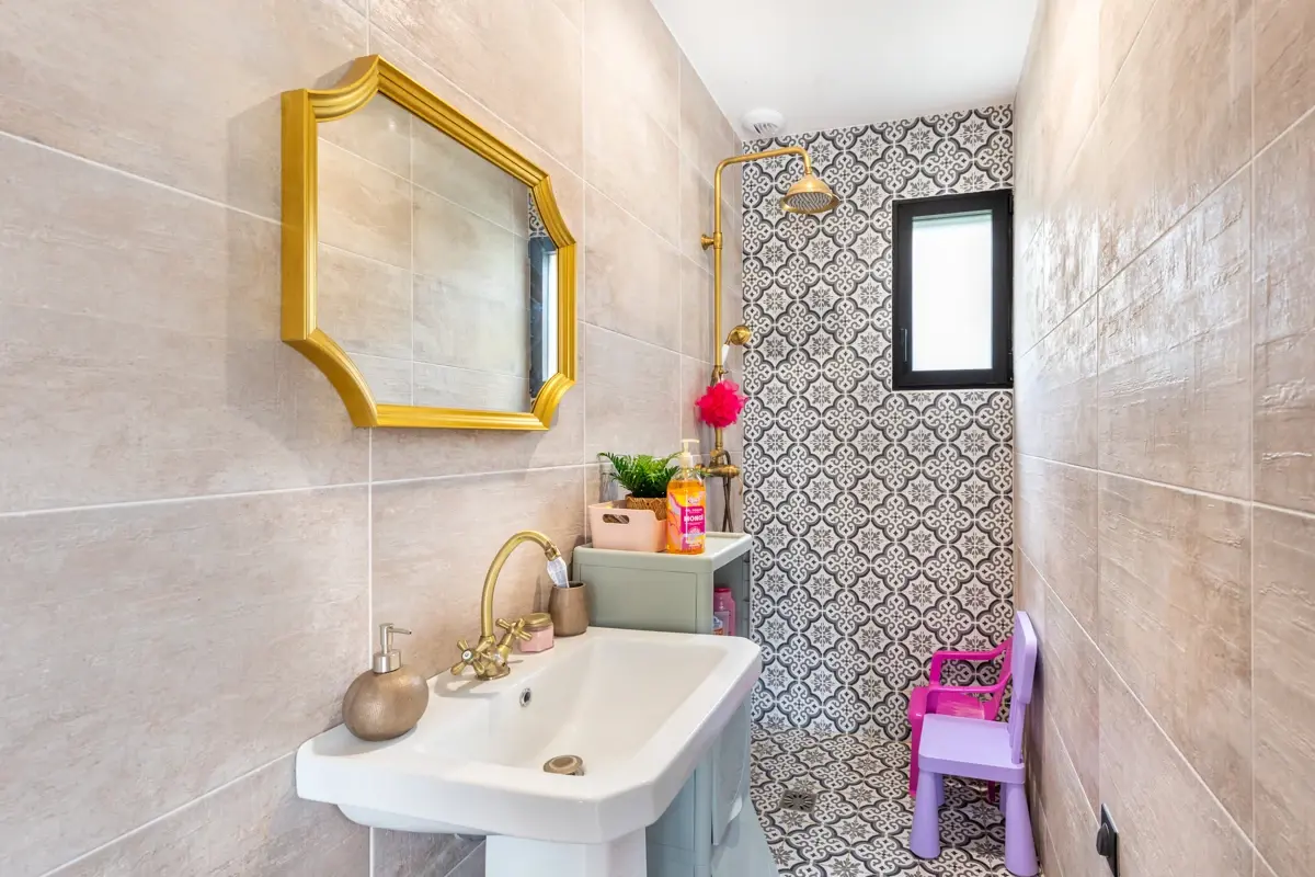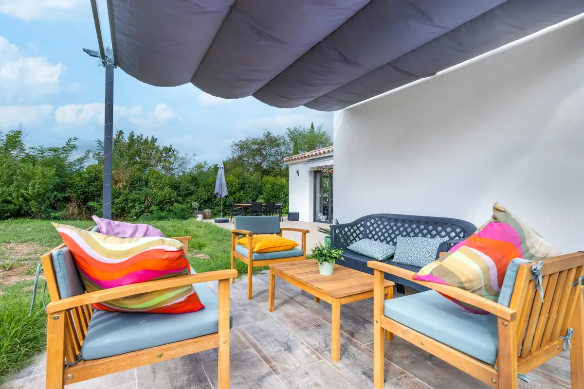 La villa dispose d'une grande terrasse carrelée ouvrant sur un jardin clos.