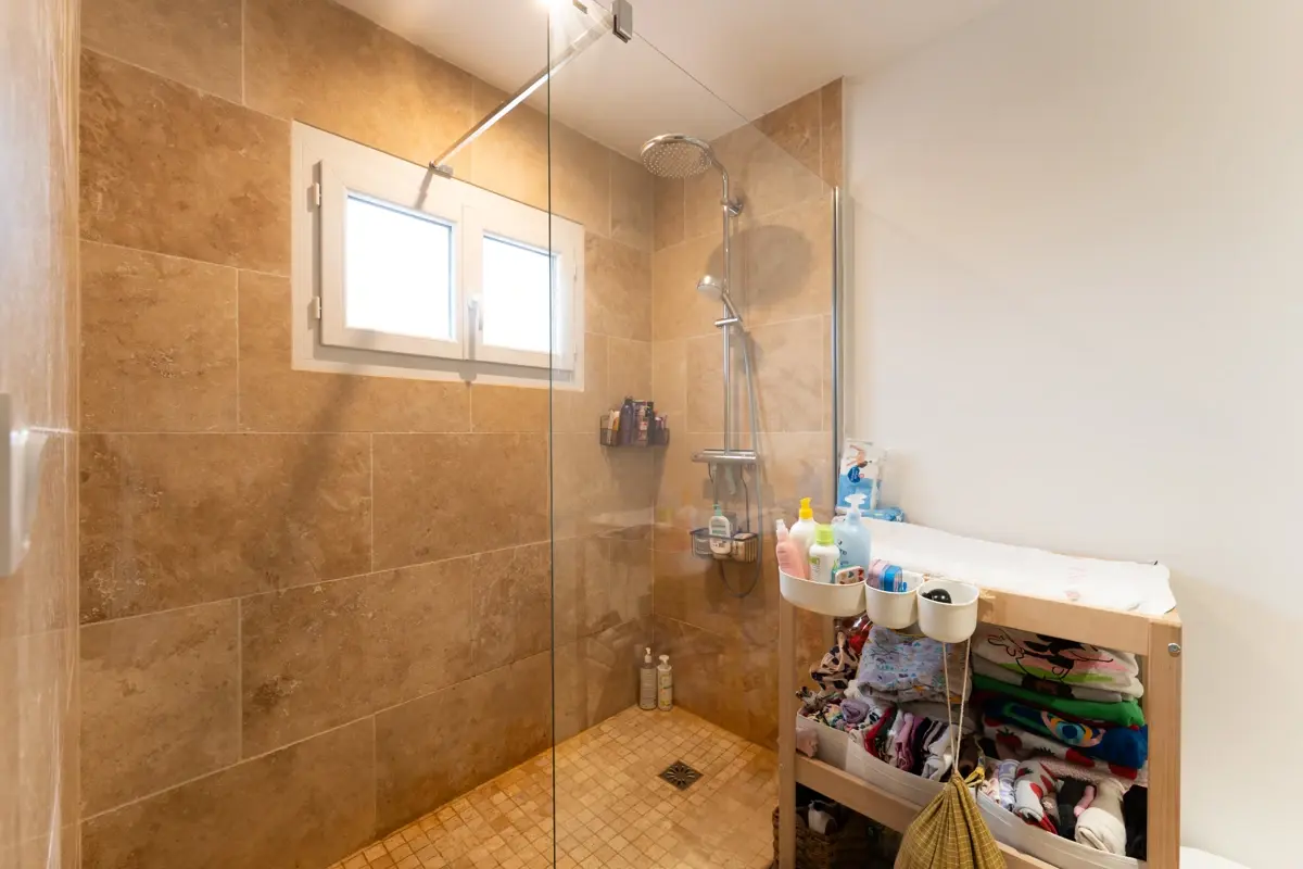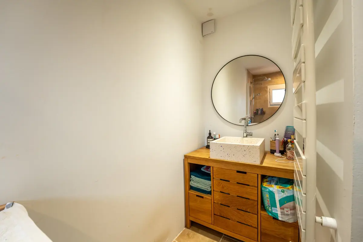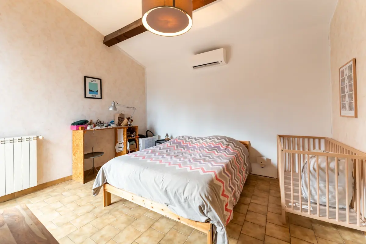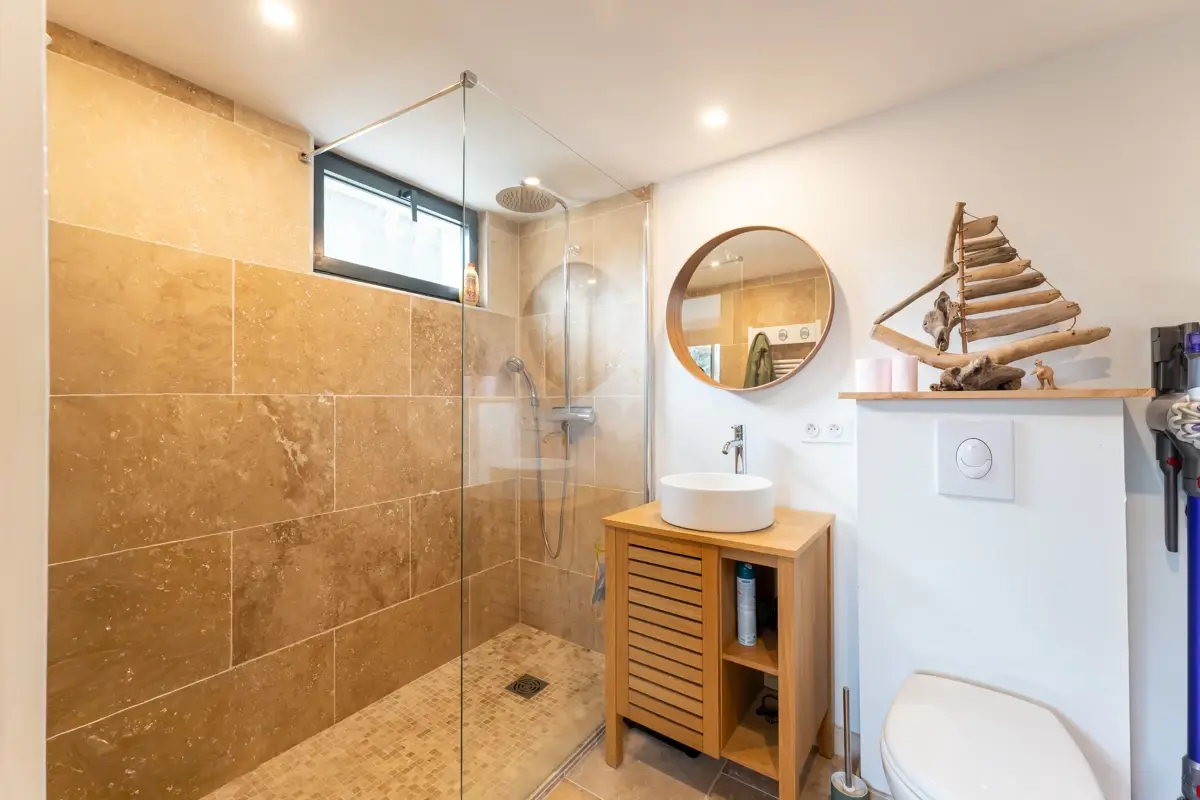 Maison principale d’environ 88 m² : au rez-de-chaussée, cuisine moderne et équipée ouverte sur un séjour traversant d’environ 42 m², une salle d’eau, un WC indépendant et une buanderie. L’étage comprend deux chambres climatisées.