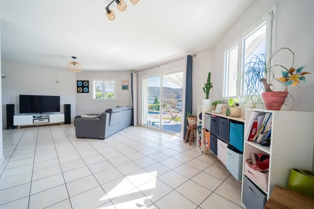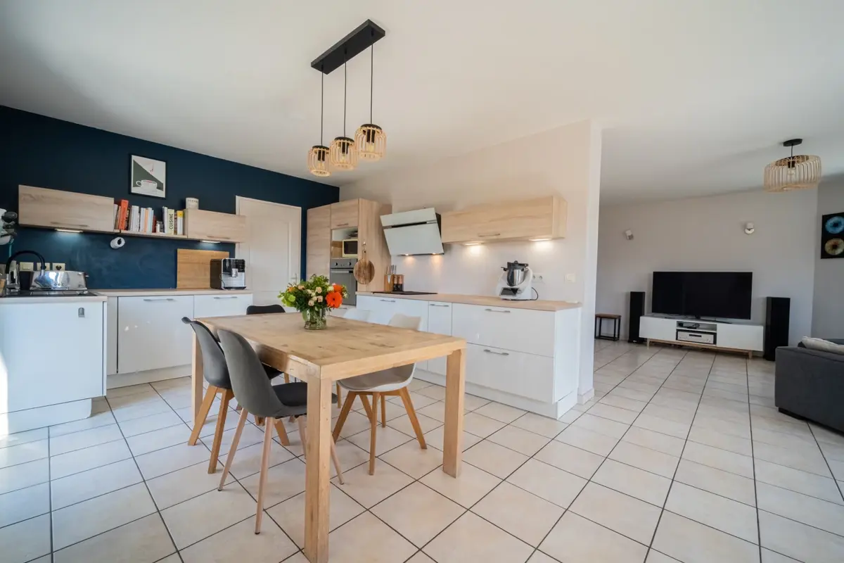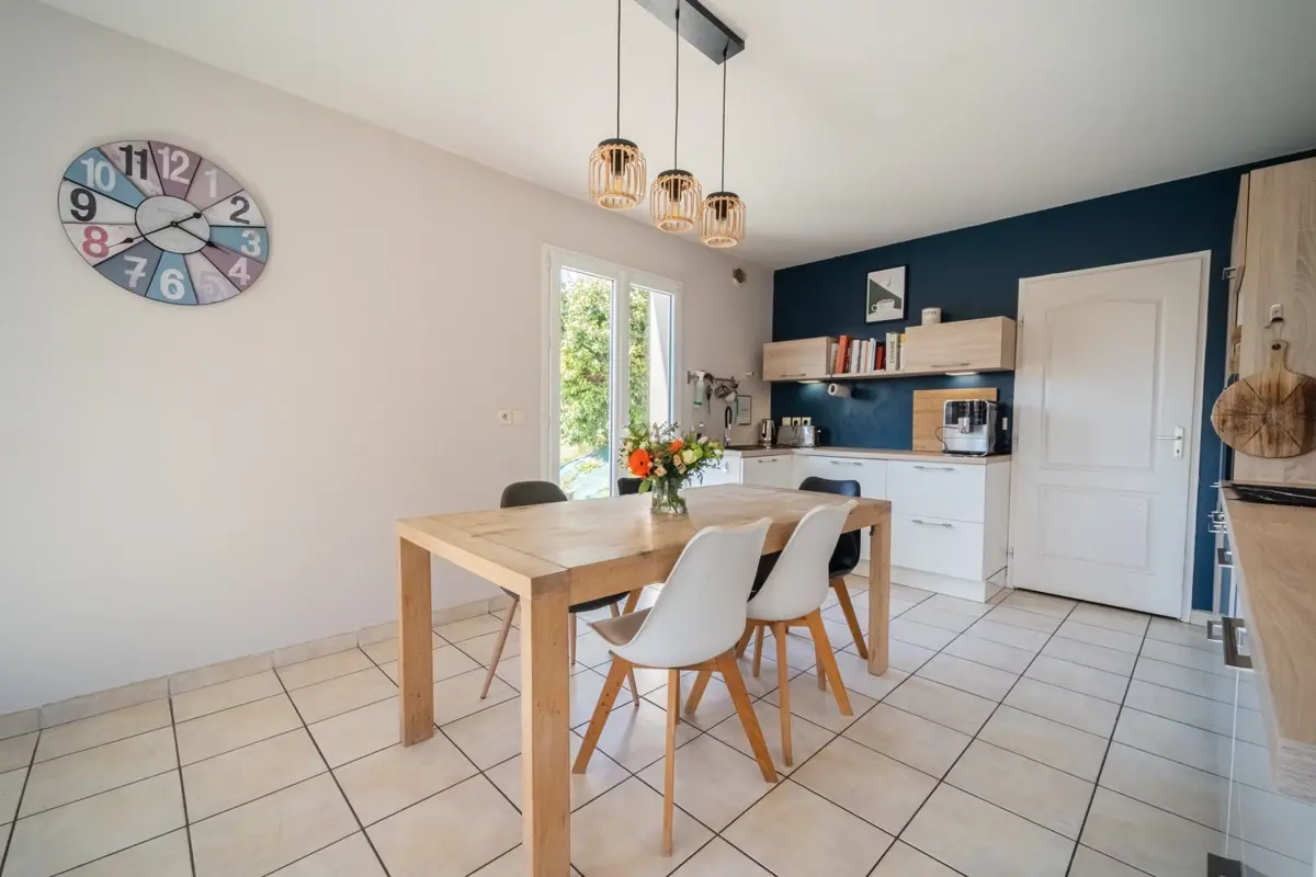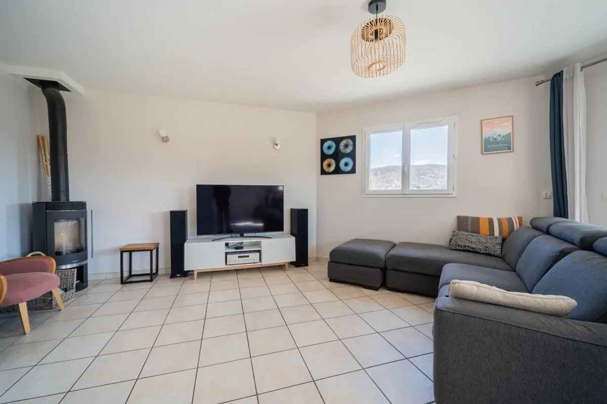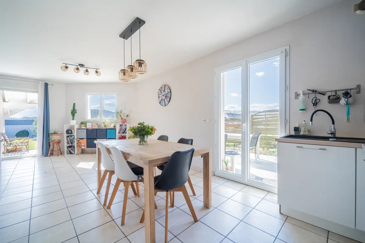 Maison construite en 2007 d'environ 111 m². La pièce de vie est lumineuse et développe près de 45 m² avec une ouverture sur la terrasse sud. Le chauffage est au sol assuré par une pompe à chaleur et complété par un poêle à bois. L'agencement global est fonctionnel et bien pensé pour la vie familiale.