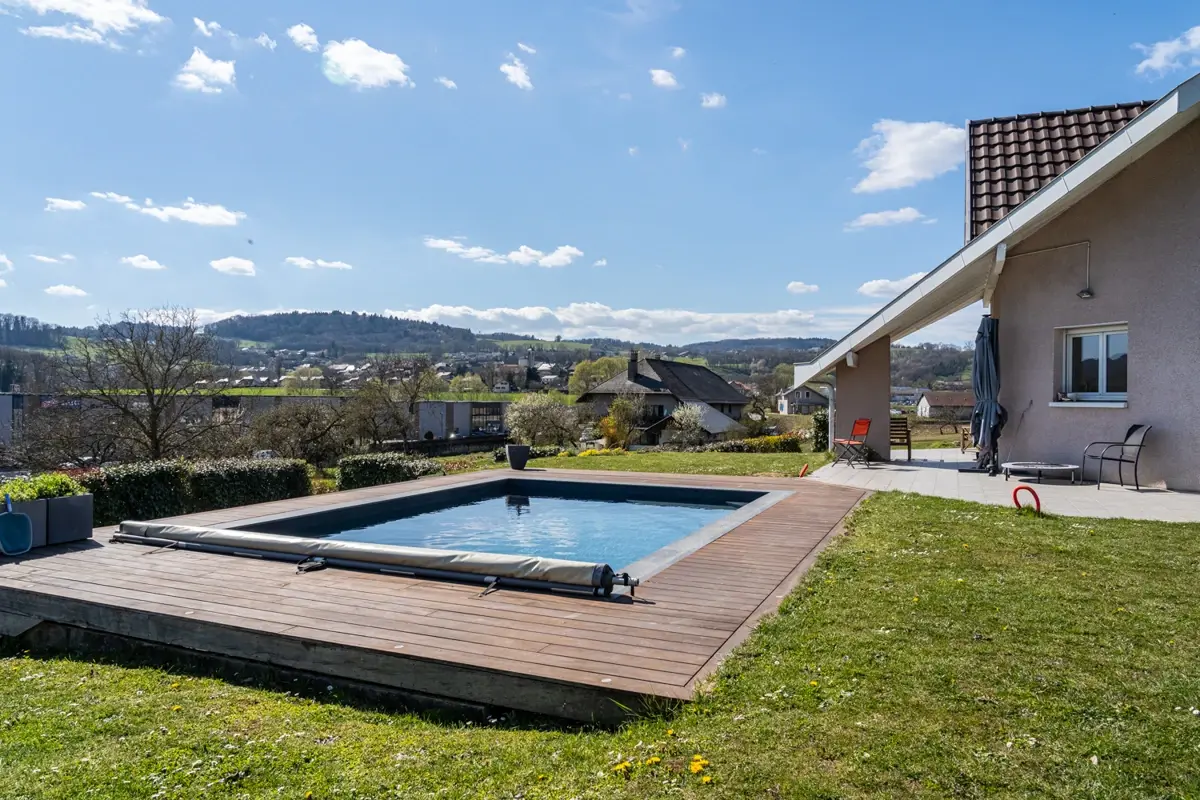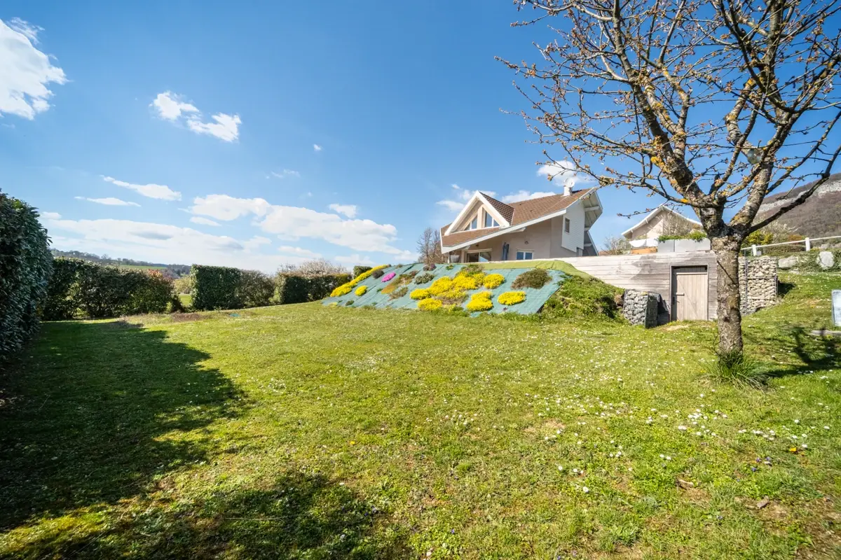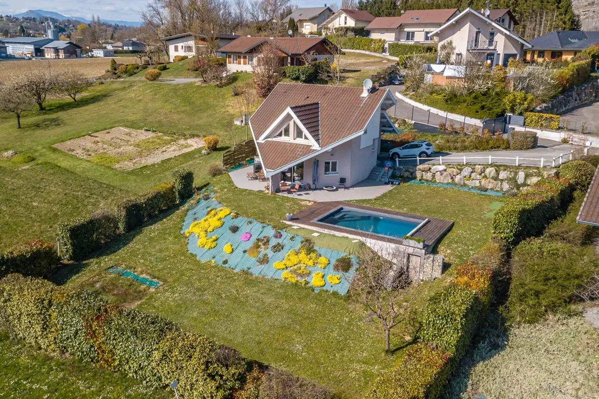 L’Office Immobilier de Sillingy vous présente à la vente en exclusivité : Maison individuelle familiale et performante de 111 m², avec jardin de plus de 1 000 m² et piscine à 15 min d'Annecy et 30 min de Genève. Vue dégagée à 270°.