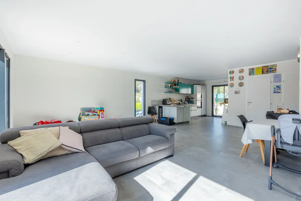 D'une surface totale de 120 m², la maison se compose d'une pièce de vie lumineuse avec cuisine ouverte équipée, une buanderie et un WC. À l'étage, vous découvrirez trois chambres spacieuses desservies par une salle de bains et un WC indépendant, offrant un espace modulable selon vos besoins. L'une des chambres est équipée d'un dressing, et les placards proposent de nombreux rangements.