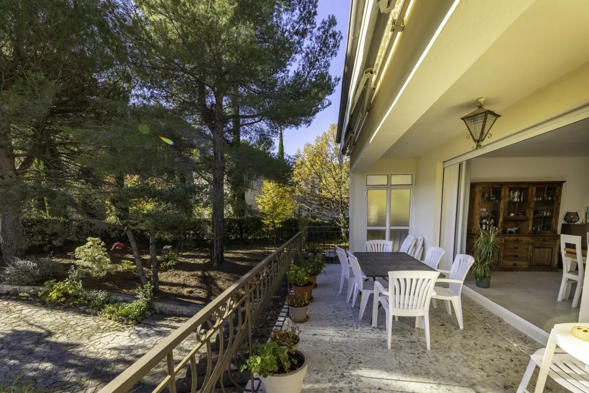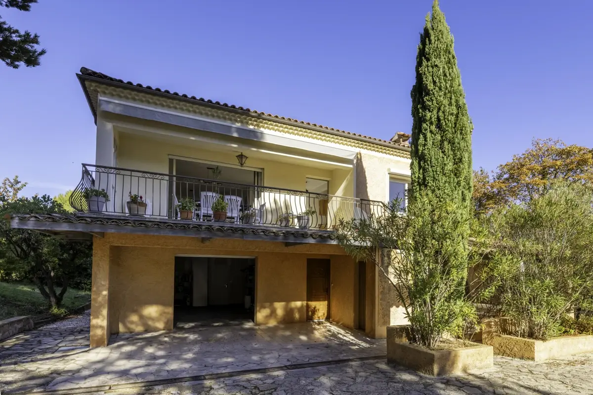 Edifiée en 1967 sur une parcelle de 1 360 m², cette maison de 125 m² dispose d'une cuisine ouverte sur un séjour lumineux avec cheminée et climatisation, ainsi qu'une terrasse privative. La partie nuit comprend une suite parentale avec balcon vue sur la Sainte-Victoire, deux chambres spacieuses partageant une salle d'eau, et un WC séparé. Un T2 indépendant et une chambre d'appoint complètent le bien au niveau inférieur.