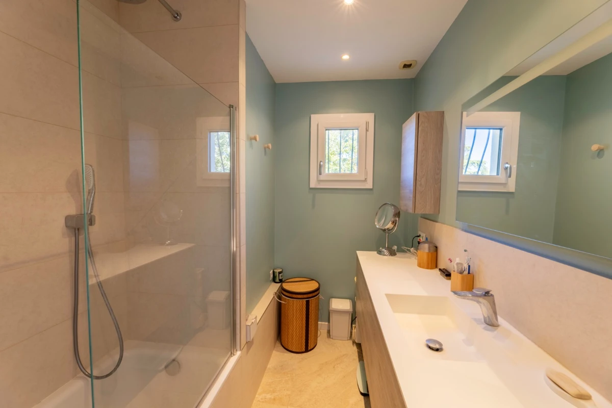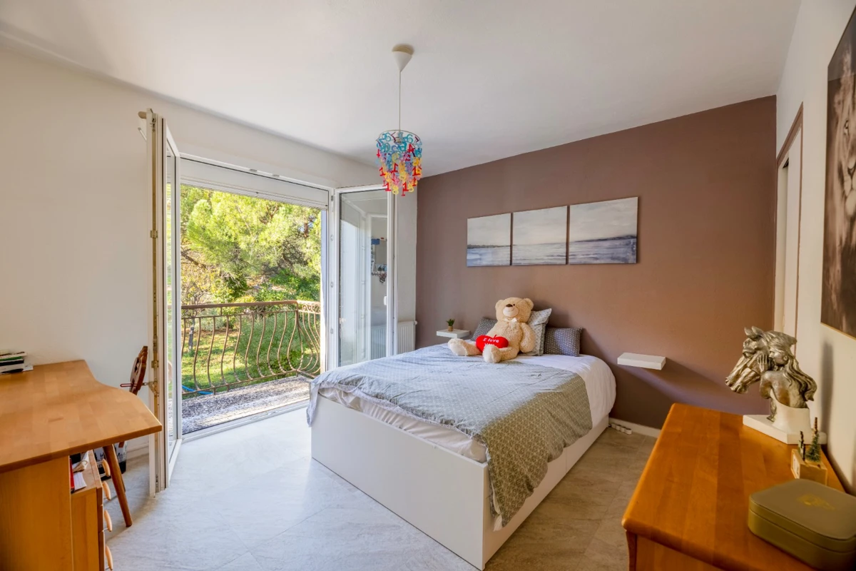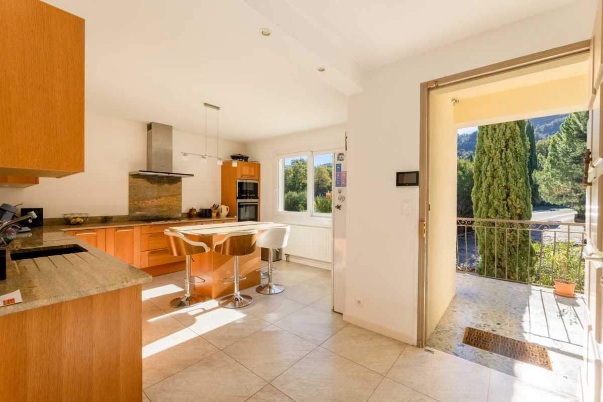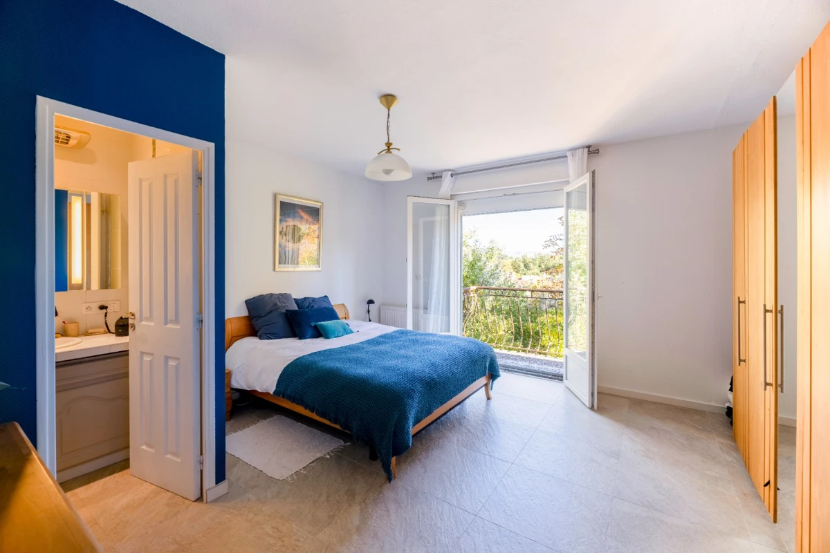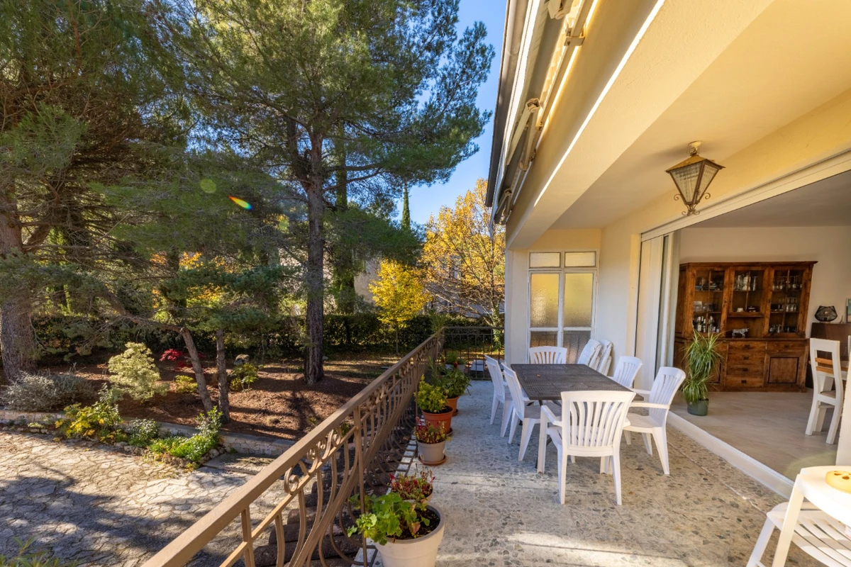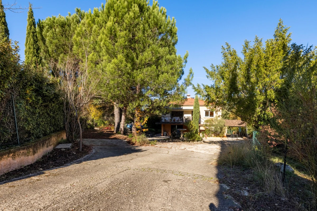Construite en 1967 sur une parcelle de 1360 m², la maison propose une cuisine ouverte sur un séjour lumineux avec cheminée et climatisation, ainsi qu'une terrasse privative. La partie nuit comprend une suite parentale avec balcon et vue sur la Sainte-Victoire, 2 chambres spacieuses qui se partageant une salle d'eau, et un WC séparé. Un T2 indépendant et une chambre d'appoint complètent le bien au niveau inférieur.