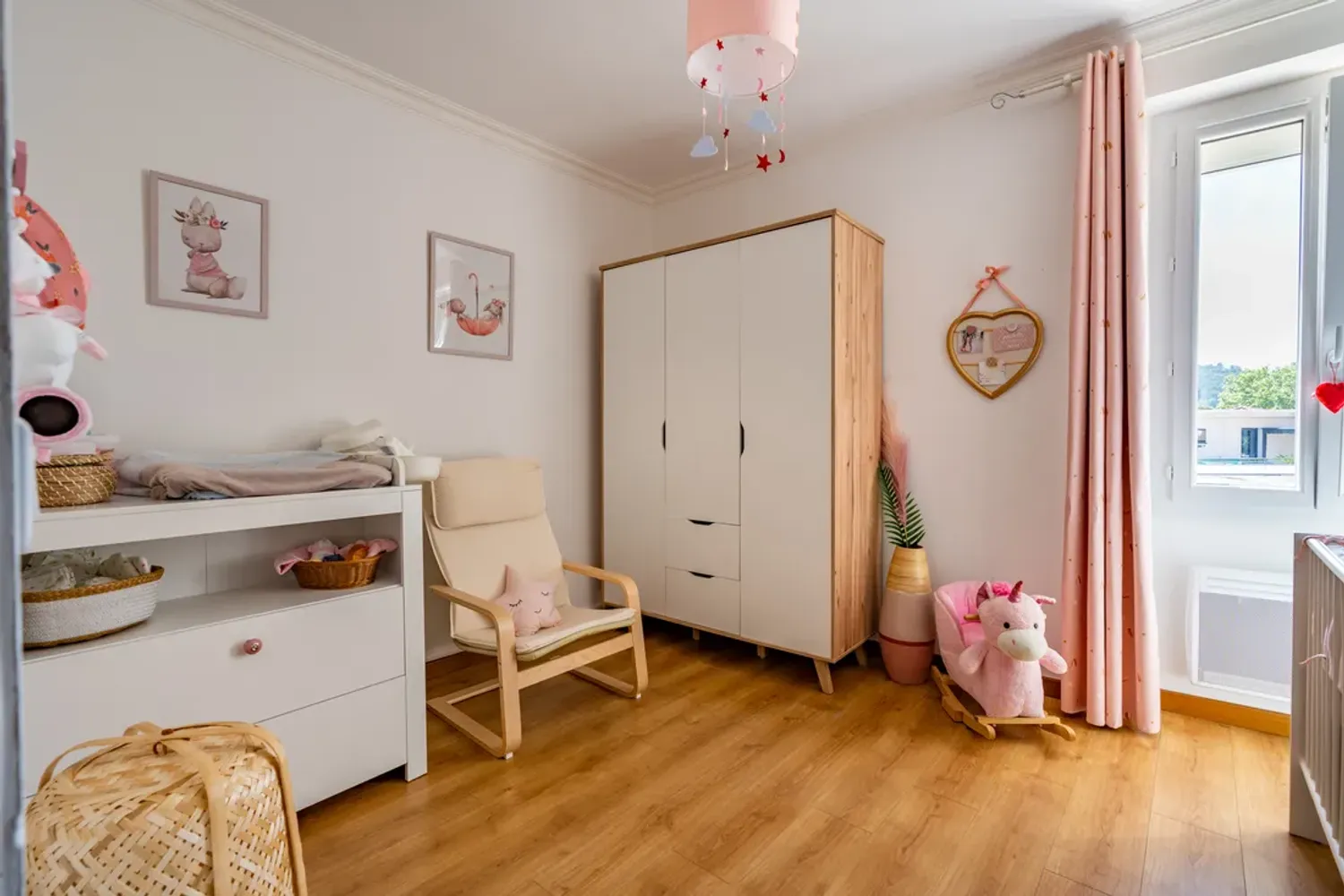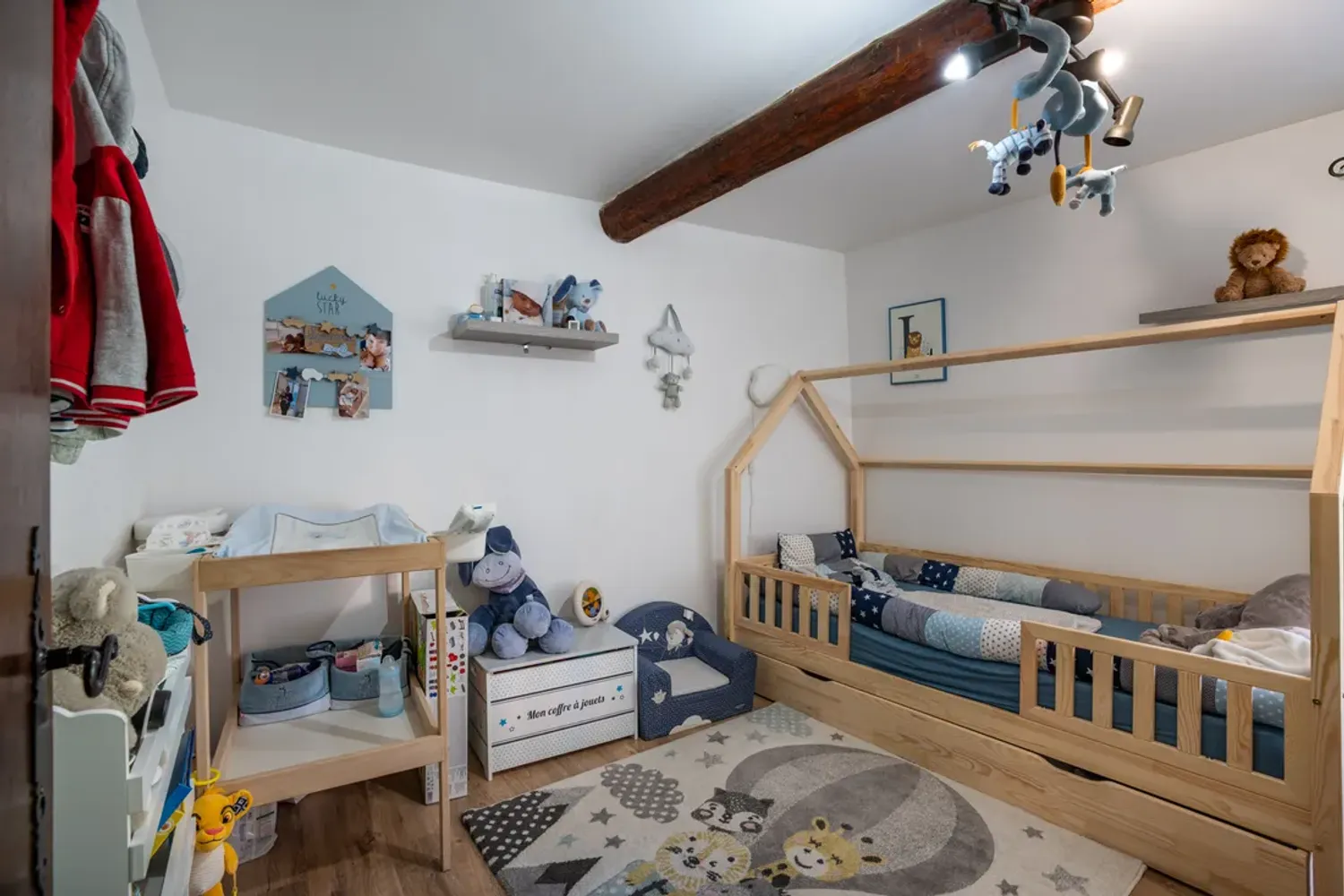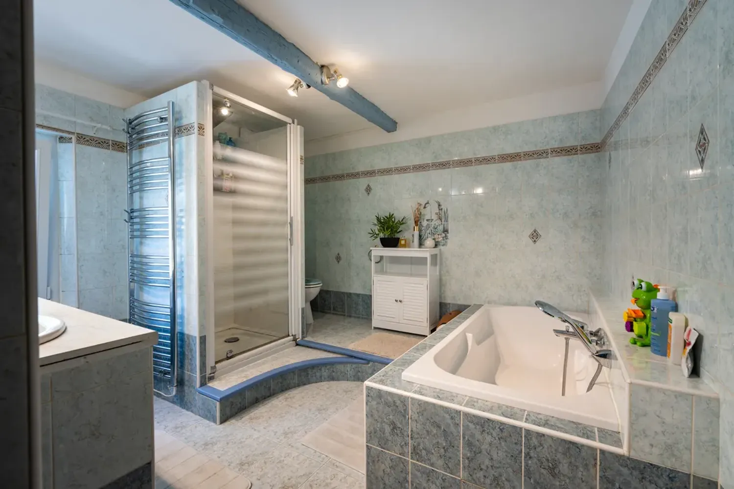A l’étage, le coin nuit propose trois chambres, un dressing et une grande salle de bain avec douche, baignoire et WC.