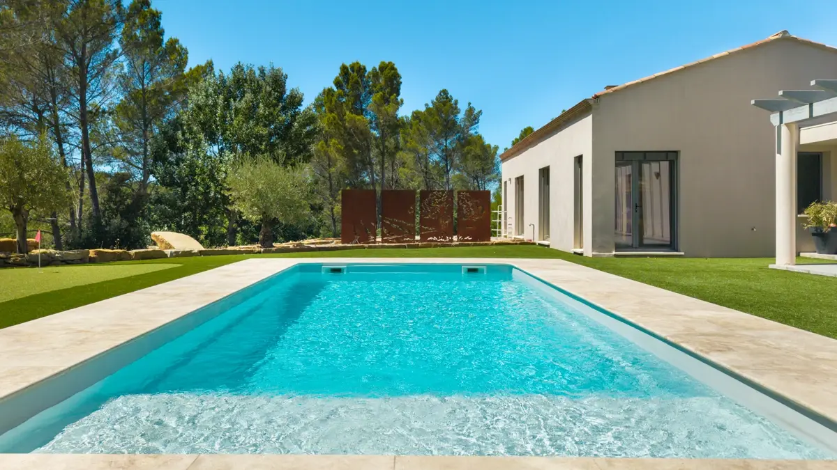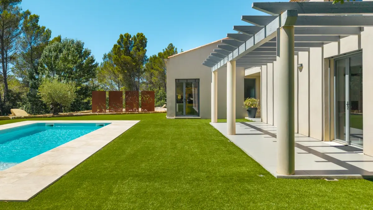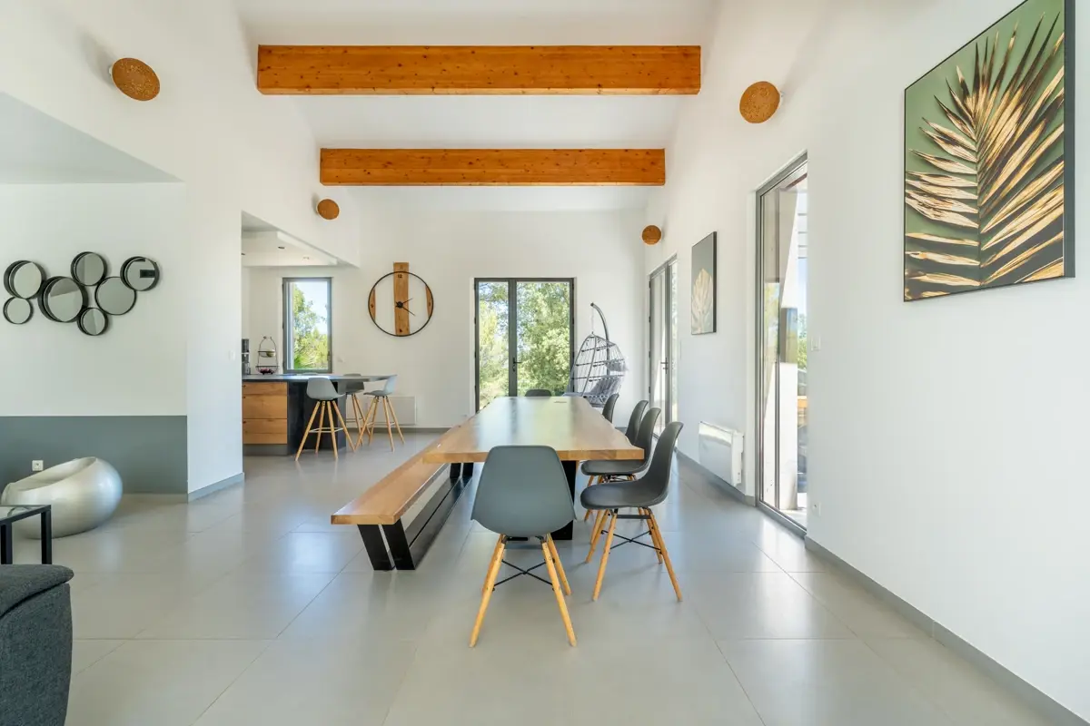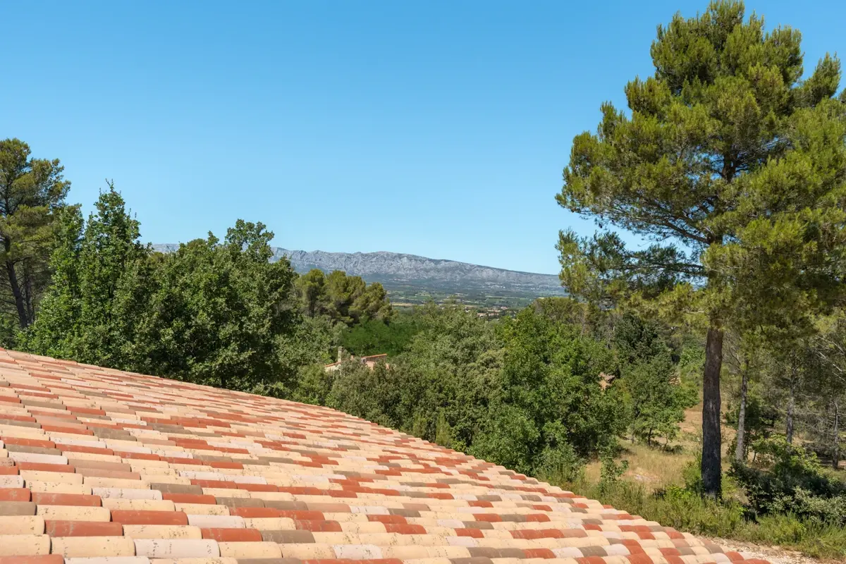 Le séjour s'ouvre sur une grande terrasse avec piscine au sel et pool house, le tout sans vis-à-vis, sur une parcelle de 8000m² avec magnifique vue sur la Sainte-Victoire.
