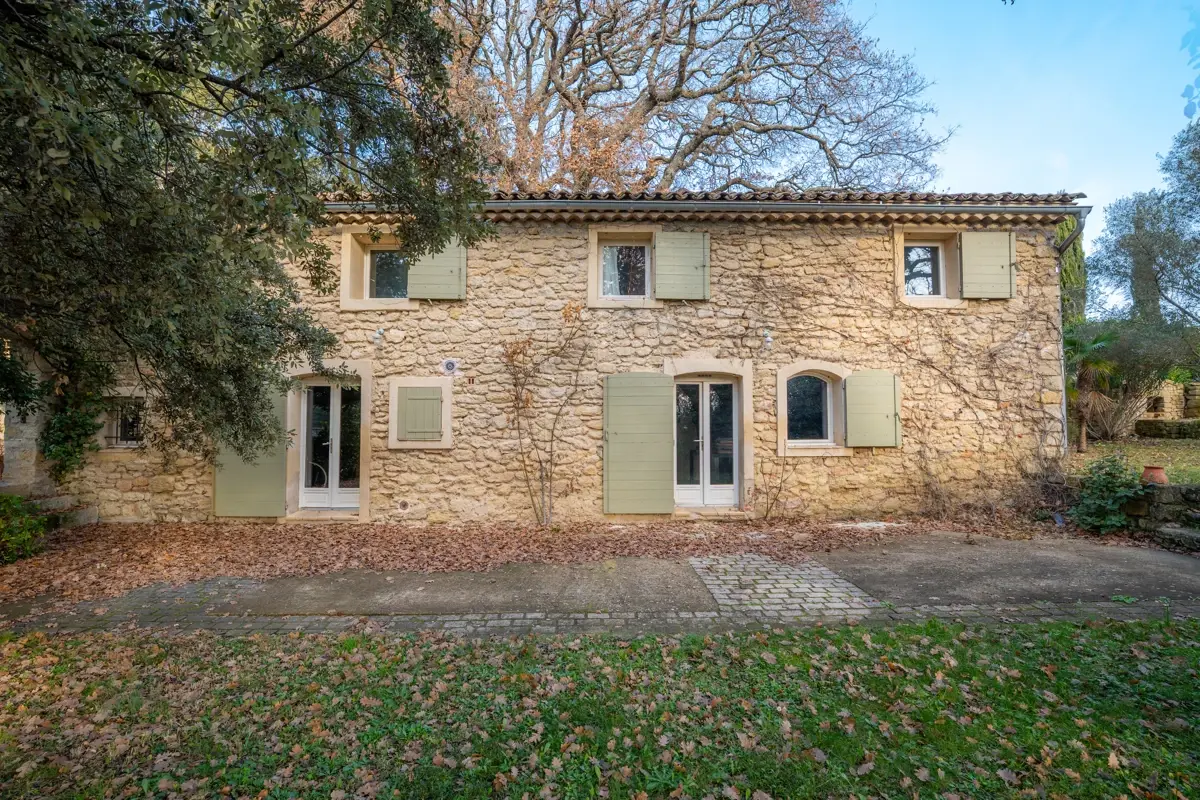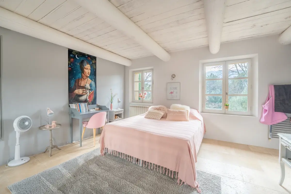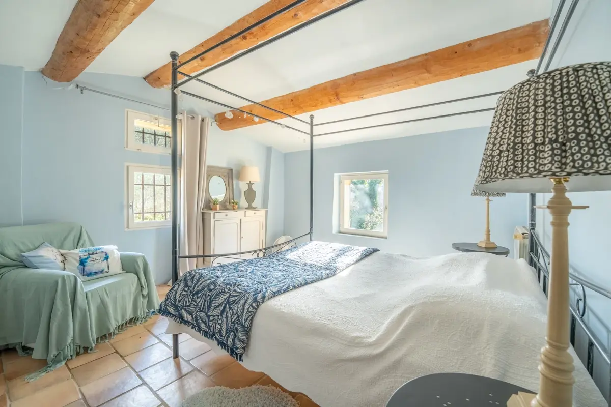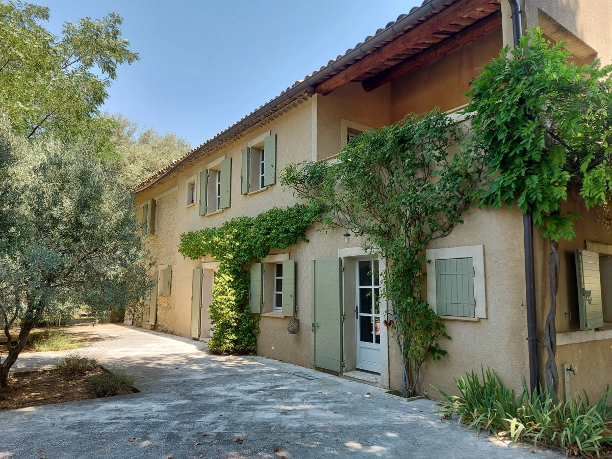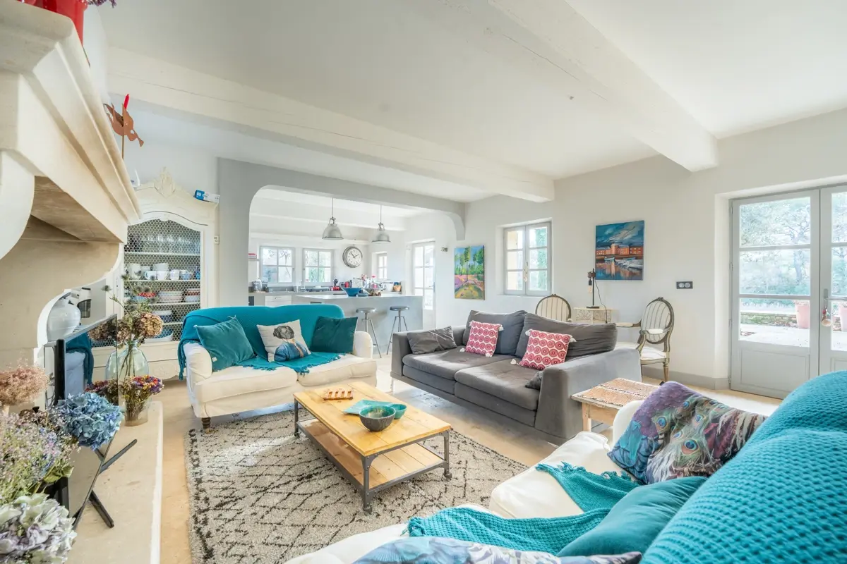 Description intérieure : La maison principale, spacieuse, comprend en rez-de-chaussée une grande pièce de vie avec cuisine ouverte, coin repas avec cheminée, et un salon indépendant donnant sur une large terrasse couverte. À l'étage, trois chambres en suite avec salle d'eau et WC indépendant. Une seconde bâtisse, entièrement en pierre, offre 120 m² supplémentaires avec une cuisine indépendante, un salon avec cheminée au plafond provençal, et trois chambres.