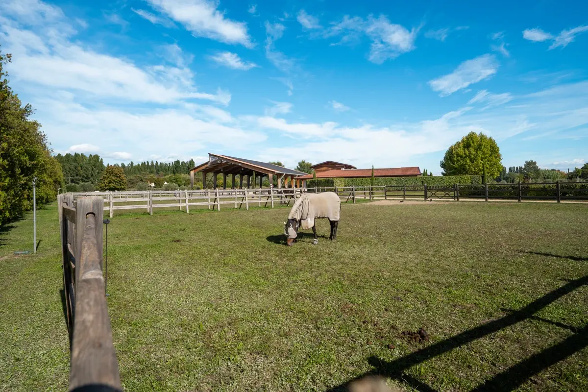 Les extérieurs incluent de nombreux paddocks aménagés avec abris, une piste de trot, une vaste carrière (100m par 50m, sable Damman avec arrosage par le sol) ainsi qu'un manège (45m par 25m, sable Toubin & Clement). Le manège est également équipé de panneaux Photovoltaïques (production de 9kw/h) et dans 10ans, ce contrat représentera une rente d'environ 50k€/an, avant cela, c'est EDF qui porte l'entretien. Le cadre est idéal pour l'entraînement des chevaux.